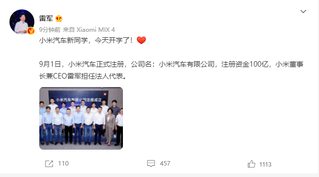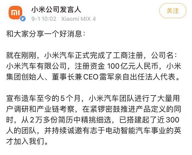 9月1日10:02,小米集团通过官方微博账号“小米公司发言人”发布消息称,就在刚刚,小米汽车正式完成了工商注册,公司名:小米汽车有限公司,注册资金100亿元人民币,小米集团创始人、董事长兼CEO雷军亲自出任法人代表。