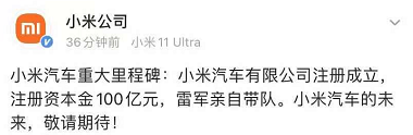 随后,@小米公司转发了上述微博,并表示“小米汽车重大里程碑:小米汽车有限公司注册成立,注册资本金100亿元,雷军亲自带队。小米汽车的未来,敬请期待!”