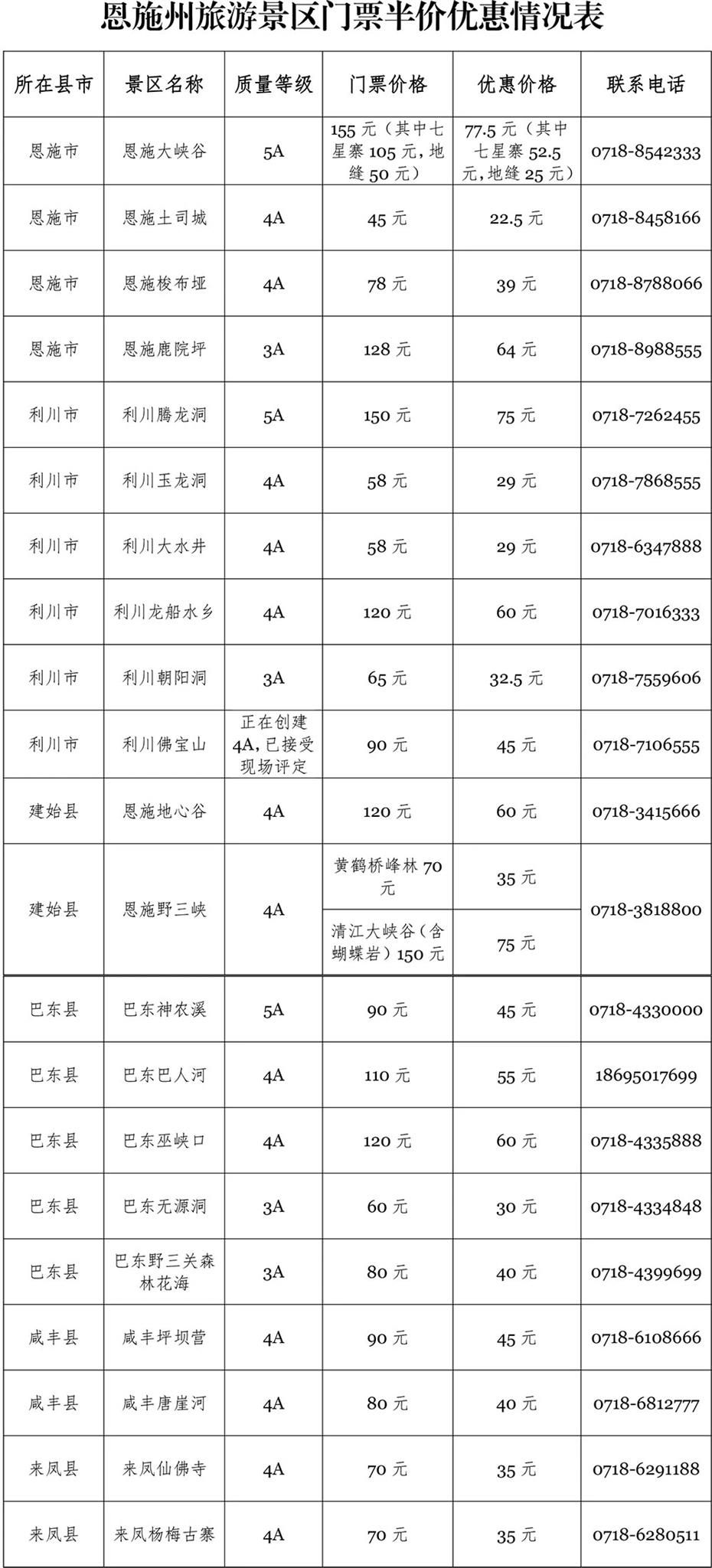 据悉,参加此次门票半价优惠活动的包括恩施大峡谷、巴东神农溪、利川腾龙洞3家5A级景区,恩施土司城、恩施地心谷、恩施梭布垭、恩施野三峡、咸丰坪坝营等13家4A级景区,恩施鹿院坪、巴东无源洞等4家3A级景区。另外,正在创建4A、已接受现场评定的利川佛宝山景区也自愿参加本次活动。