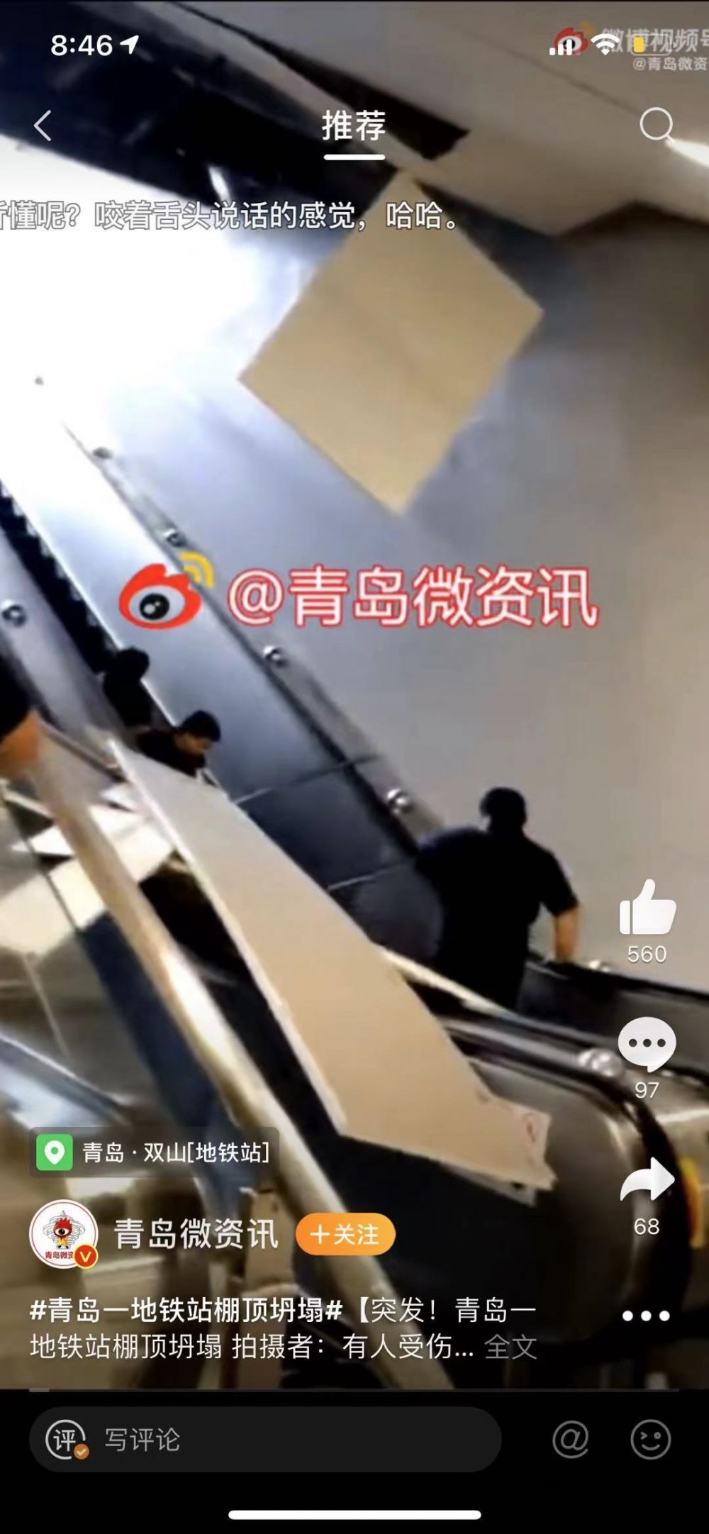 9月1日,有网友发布视频称,青岛地铁3号线双山站内,“电梯上方棚顶出现坍塌”,有人受伤。视频显示,事故现场有相关人员正在处置。