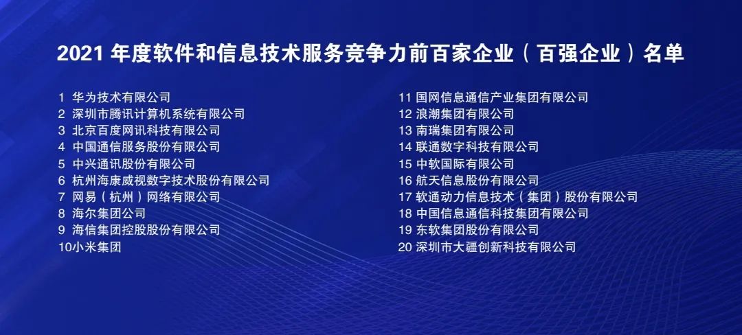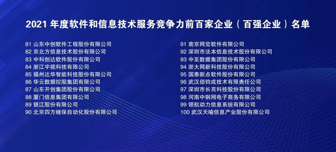 8月27日,中国电子信息行业联合会主办的2021年度软件和信息技术服务企业竞争力报告及前百家企业发布会在北京举办。中国信科、佰钧成、领航动力、天喻信息等4家企业入选百强榜单,分列第18、96、99、100位。