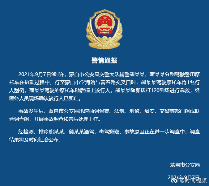 云南蒙自市公安局9月7日发布警情通报:2021年9月7日9时许,蒙自市公安局交警大队辅警熊某某、蒲某某分别驾驶警用摩托车在执勤过程中,行至蒙自市学海路与富春路交叉口时,熊某某驾驶摩托车将1名行人刮倒,蒲某某驾驶的摩托车随后撞上该行人,熊某某随即拨打120到场进行急救,经医务人员现场确认该行人已死亡。