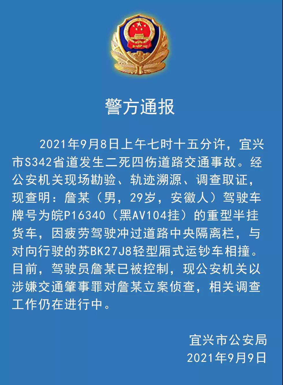 9月8日上午7时15分许,宜兴市S342省道发生2死4伤道路交通事故。经公安机关现场勘验、轨迹溯源、调查取证,现查明:詹某(男,29岁,安徽人)驾驶车牌号为皖P16340(黑AV104挂)的重型半挂货车,因疲劳驾驶冲过道路中央隔离栏,与对向行驶的苏BK27J8轻型厢式运钞车相撞。