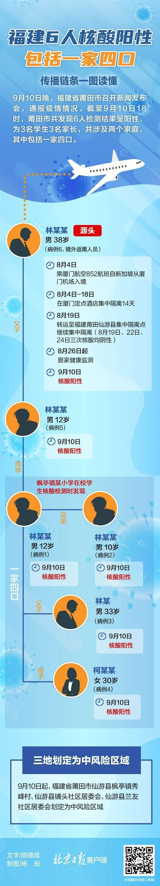 病例6:林某某,男,38岁,为病例5的父亲,9月10日核酸检测结果阳性,已转至定点医院莆田学院附属医院救治。经流调发现,该病例为境外返莆人员,8月4日乘坐厦门航空852航班自新加坡从厦门机场入境,在厦门定点酒店集中隔离14天后,于8月19日点对点转运至仙游县集中隔离点继续集中隔离,(8月19日、22日、24日三次核酸检测均为阴性),后于8月26日起实行居家健康监测。