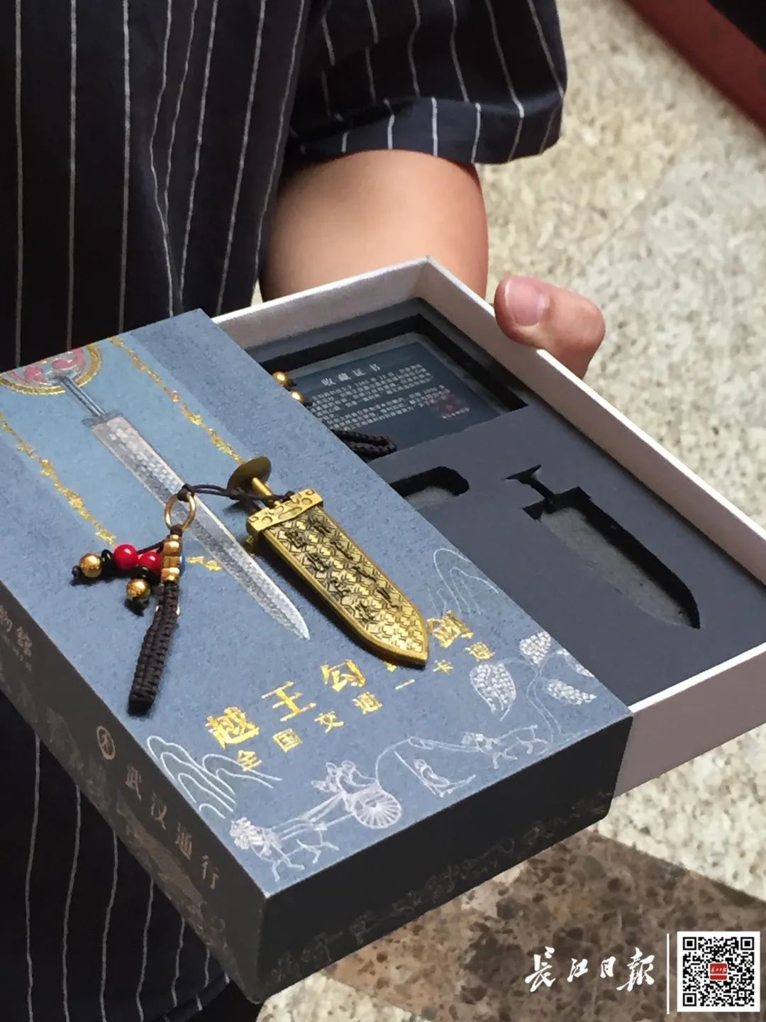 “越王勾践剑交通卡”外形为越王勾践剑缩微版,长7厘米,普通钥匙大小,为树脂材料、金属喷漆,剑身“越王鸠浅 自作用剑”鸟篆铭文清晰可见,配有古典样式的挂绳,包装盒内有收藏证书,背面写有使用须知。