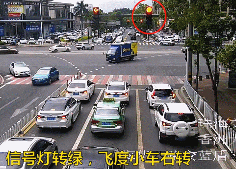 一直等到信号灯变成绿灯,白色小车启动转弯,后面的SUV赶紧跟上。