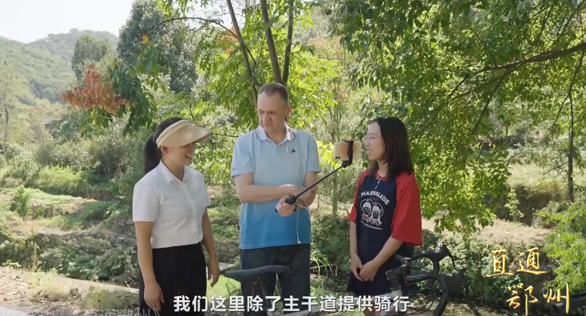 鄂州岳石洪村党支部副书记 杨云琳:“你好,你好!欢迎来到我们岳石洪村,前面有两辆山地自行车,这个公路高低起伏,在骑游的过程中,你可以感受到山地自行车的乐趣。”