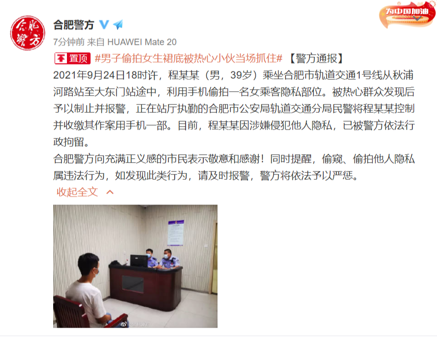 合肥警方表示,向充满正义感的市民表示敬意和感谢!同时提醒,偷窥、偷拍他人隐私属违法行为,如发现此类行为,请及时报警,警方将依法予以严惩。