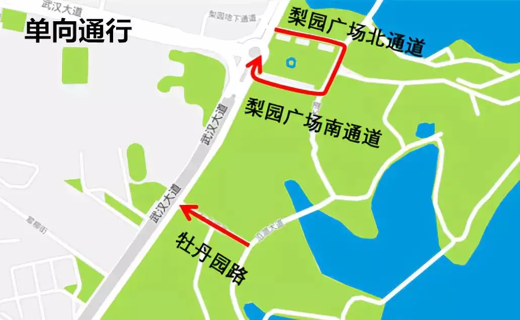 梨园广场北路→沿湖大道→梨园广场南路(遇二环线梨园环岛拥堵时,临时封闭广场南路)车辆由沿湖大道→牡丹园路→二环线辅道。