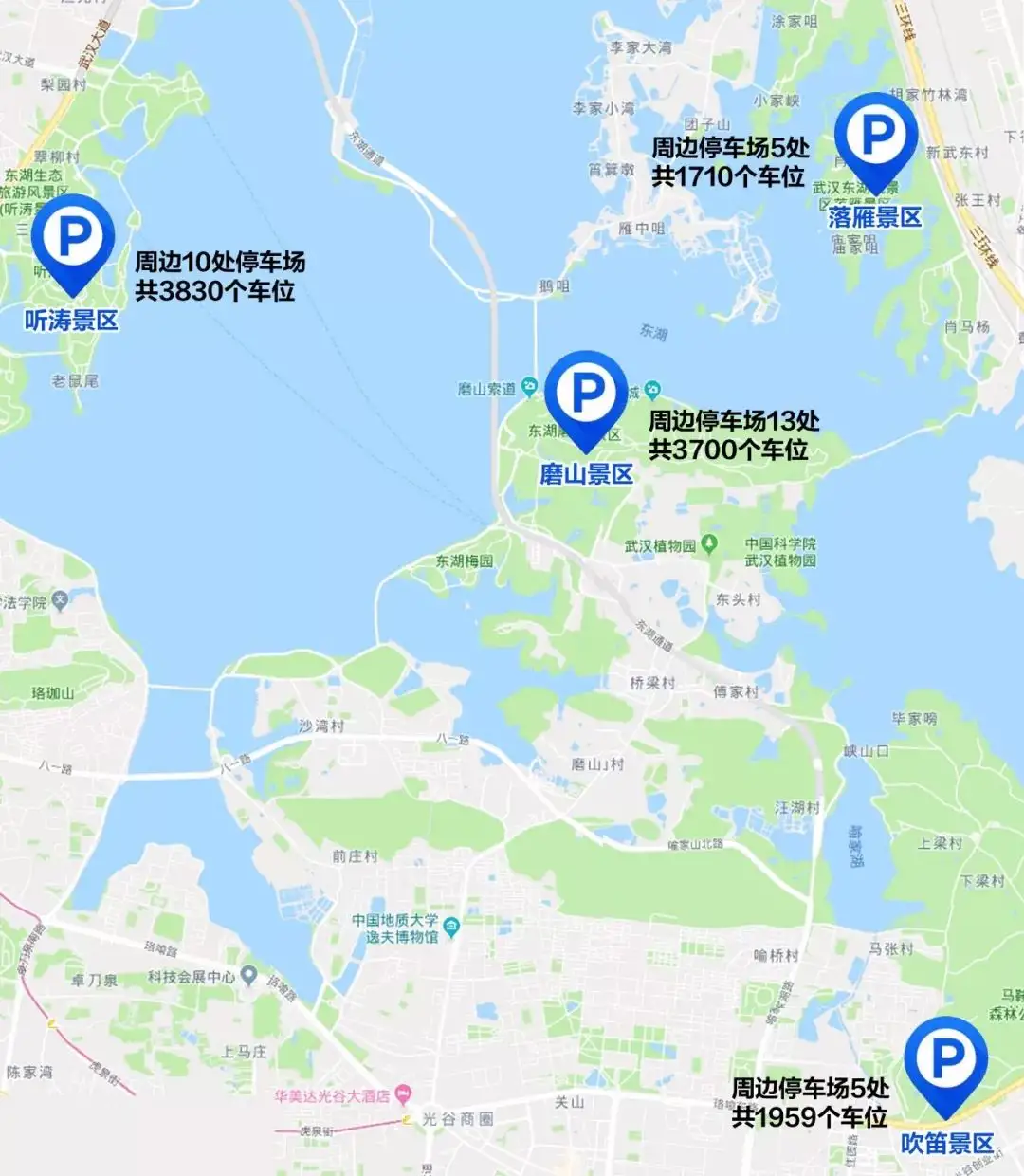 东湖绿道南门户樱花园停车场有950个车位,访梅路临时停车场及现状路边停车泊位共300个。梅园东停车场可提供停1000个停车位,武汉植物园可提供300个停车位。