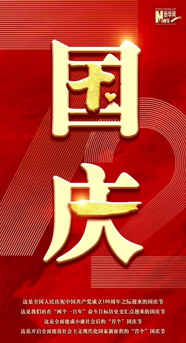 这是全国人民庆祝中国共产党成立100周年之际迎来的国庆节,是我们站在“两个一百年”奋斗目标历史交汇点迎来的国庆节,也是全面建成小康社会后的“首个”国庆节,是开启全面建设社会主义现代化国家新征程的“首个”国庆节。