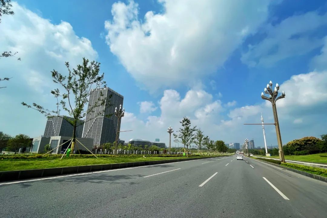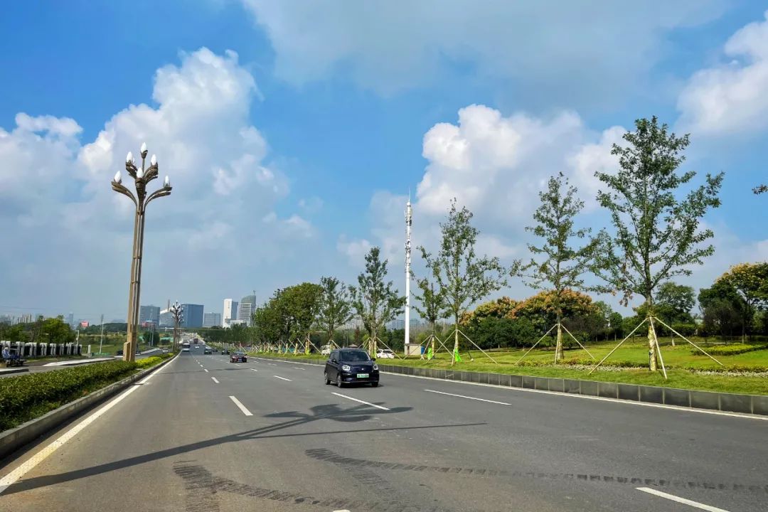 高新大道(外环线-短咀里湖大桥)全长6.745公里,主道双向8 车道、辅道双向4 车道,今年4月进场施工,今日主道通车。已种植樟树、娜塔栎树、榉树近400棵,中央绿化带草坪5.9万平方米。