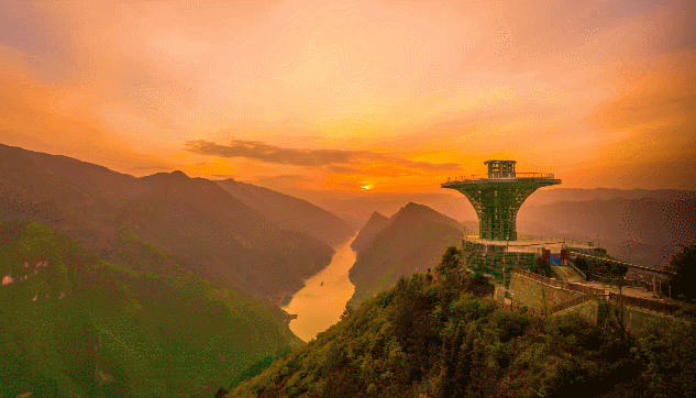 长江在这里90°大拐弯,这里群峦叠嶂、峡谷幽深,是观巫峡云海、摄峡江落日的最佳观景点,是俯视长江第一拐,鸟瞰巴东新城全景的制高点。