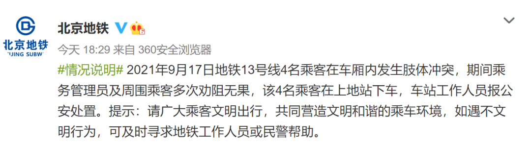 此前,@北京地铁 曾通报13号线4名乘客在车厢内发生肢体冲突。