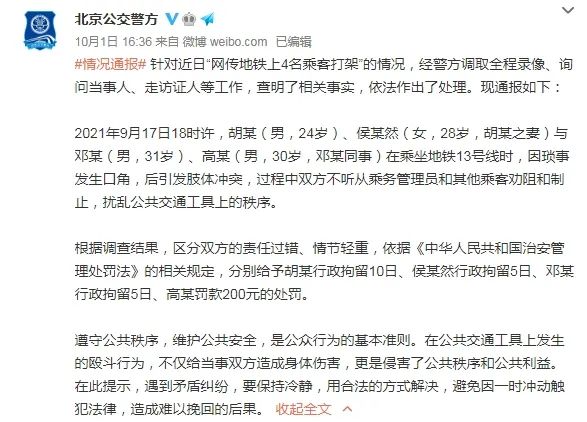 10月1日,北京公交警方通报,针对近日“网传地铁上4名乘客打架”的情况,经警方调取全程录像、询问当事人、走访证人等工作,查明了相关事实,依法作出了处理。