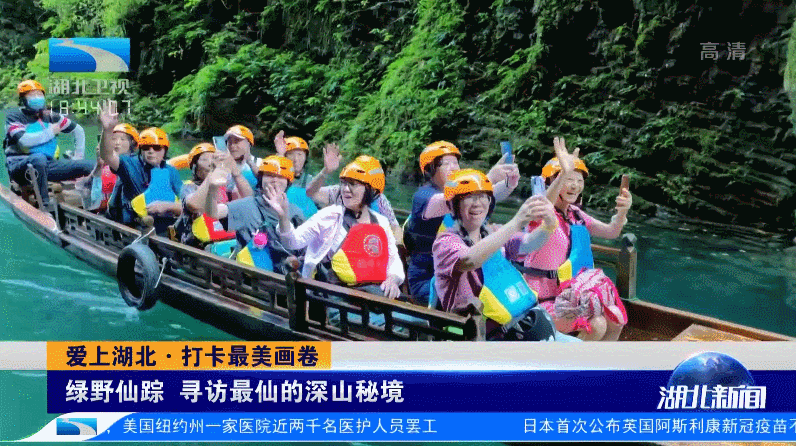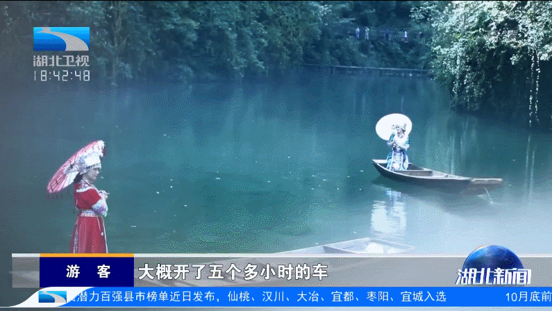 记者王缘:“现在我们来到了恩施鹤峰的屏山风景区里,大家可以看到旁边有非常多的游客。每一个来这里打卡的游客,都会选择在正午阳光照进谷底的时候,来上一张‘木船悬浮照’。为什么选择大中午的时候来拍呢? 因为只有在中午的时候,太阳光才能够直射到水面里,水才能够变得非常的清澈,那么我们的悬浮照的效果才能达到最好。”