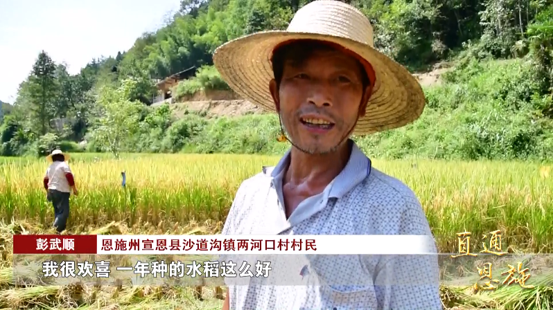 恩施州宣恩县沙道沟镇两河口村村民 彭武顺:“我很欢喜,一年种的水稻这么好,大概一亩多能收一千五六百斤。”