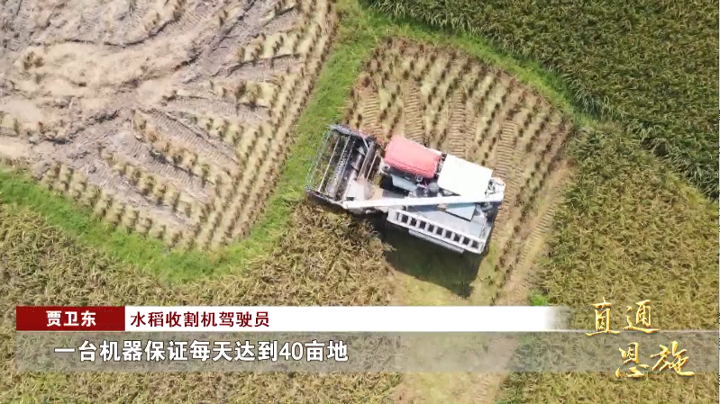 水稻收割机驾驶员 贾卫东:“每年都来这里,保证这里的粮食颗粒归仓,一台机器保证每天达到40亩地。”