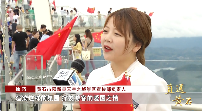 黄石市阳新县天空之城景区宣传部负责人 徐巧:“整个景区都是张灯结彩,插上了很多国旗,包括灯笼这样的布置,节假日期间我们也给游客发放手持小红旗,包括印有我爱你中国字样的口罩,渲染这样的氛围,抒发游客的爱国之情。”