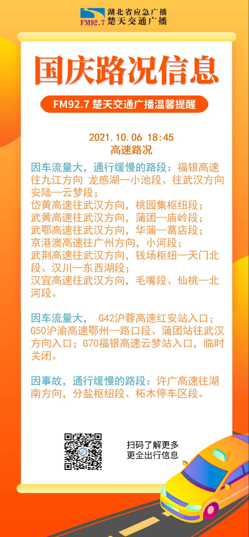因车流量大,G42沪蓉高速红安站入口;G50沪渝高速鄂州—路口段、蒲团站往武汉方向入口;G70福银高速云梦站入口,临时关闭。