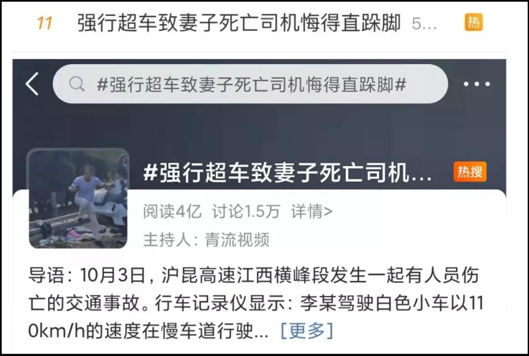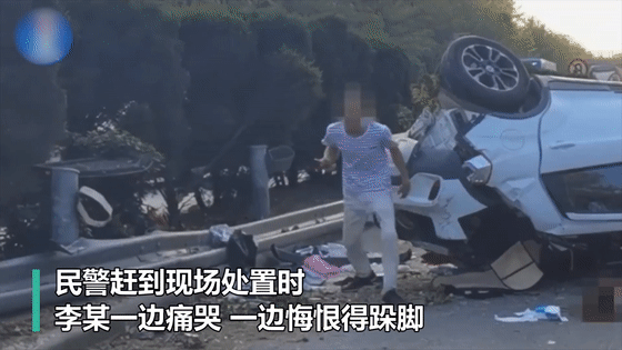 近日,江西横峰的高速路段发生了一起事故,一名男子强行超车,结果导致妻子在事故中殒命。车翻在地,他心痛得在一旁直跺脚。
