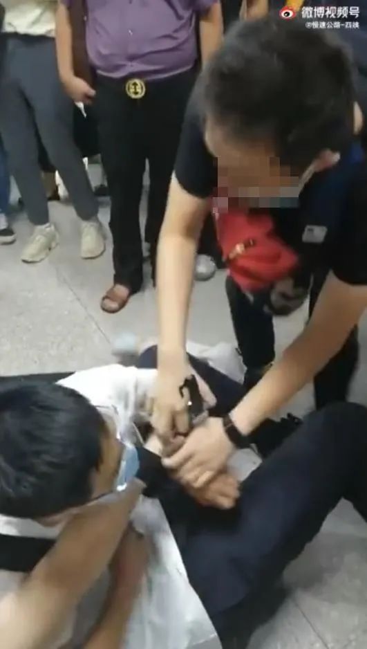 6时许,下班回家的浦东分局出入境管理办公室民警谢骥越(视频中抱住嫌疑人的白色T恤男子)在13号线转8号线的通道内行走,听到前方市民在喊“出事了”,急忙上前,看见一名身着便服的青年在报警号。