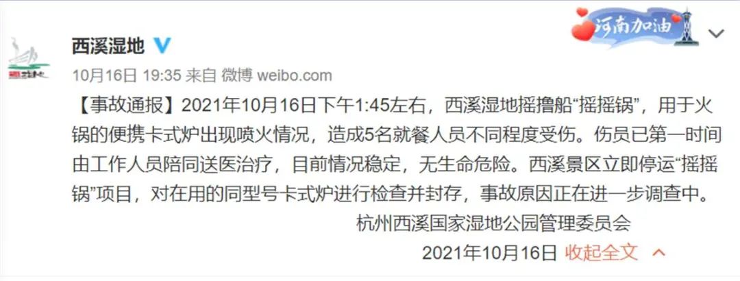 目前,西溪景区已经停运“摇摇锅”项目,对在用的同型号卡式炉进行检查并封存,事故原因正在进一步调查中。