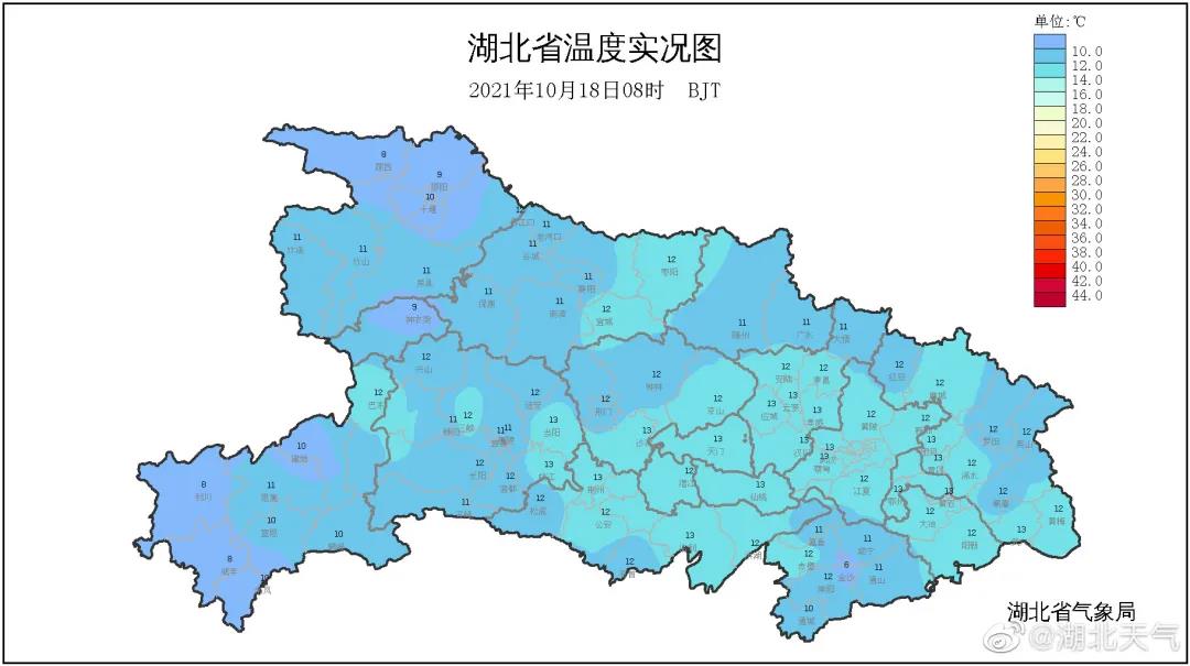 据@湖北气象,早上8点,湖北全省有7个县市气温不足10℃,低温主要出现在恩施和十堰,其他大部分地区气温不足13℃。
