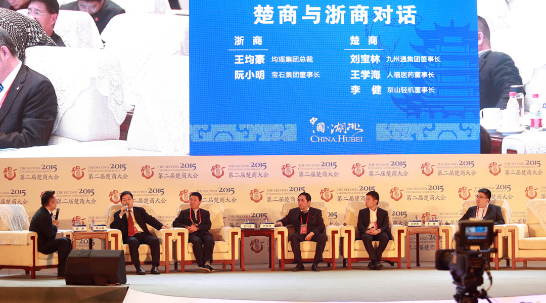 两年之后,2015 年 11 月 11 日第二届楚商大会召开,“楚商携手合作,共促转型发展”的抱团口号,仍旧作为此次楚商大会的主题,而且几乎每场活动上也都能听到与“抱团发展”相关的声音,“抱团”已经成为天下楚商共同的心理诉求。