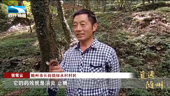 随州市长岗镇绿水村村民 张雪云:“它的药效就是消炎、止痛,药材功能特别多,现在政策好了,扶持我们种药材一年可挣五六万。”