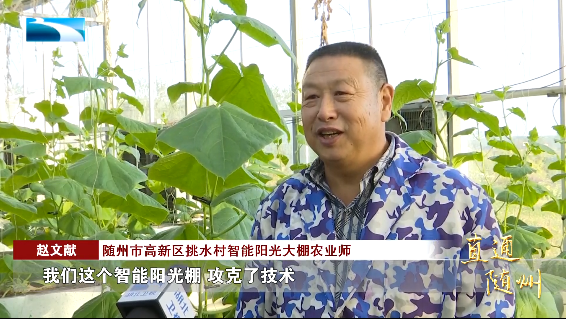 随州市高新区挑水村智能阳光大棚农业师 赵文献:“我们这个智能阳光棚攻克了技术,里面有热带水果比如百香果、火龙果、无花果、菠萝等十几个品种,这个大棚投资有600多万,到今年十月份已经给我们带来了效益50多万元。”