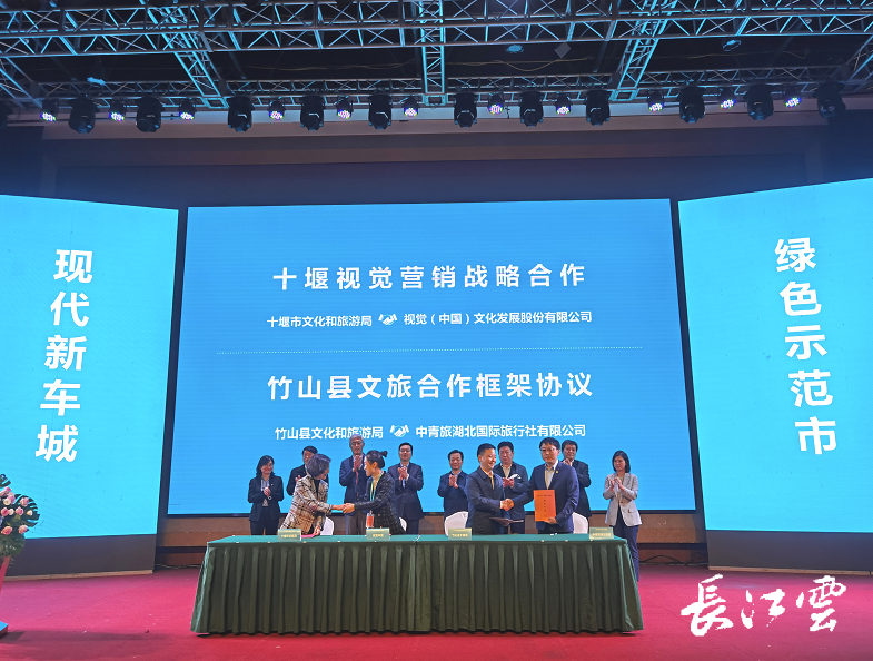 推介会上,中青旅控股与十堰市人民政府签署了战略合作协议;十堰市文化和旅游局与视觉(中国)文化发展股份有限公司签约了十堰视觉营销战略合作协议;竹山县文化和旅游局与中青旅湖北国际旅行社有限公司签订了竹山县文旅合作框架协议;竹溪县文化和旅游局与云南郧商集团有限公司签订了竹溪县国际健康养老中心项目投资框架协议;郧阳区龙吟峡仙女洞旅游开发公司与中青旅文旅产业发展有限公司签订了郧阳区龙吟峡仙女洞景区托管协议。