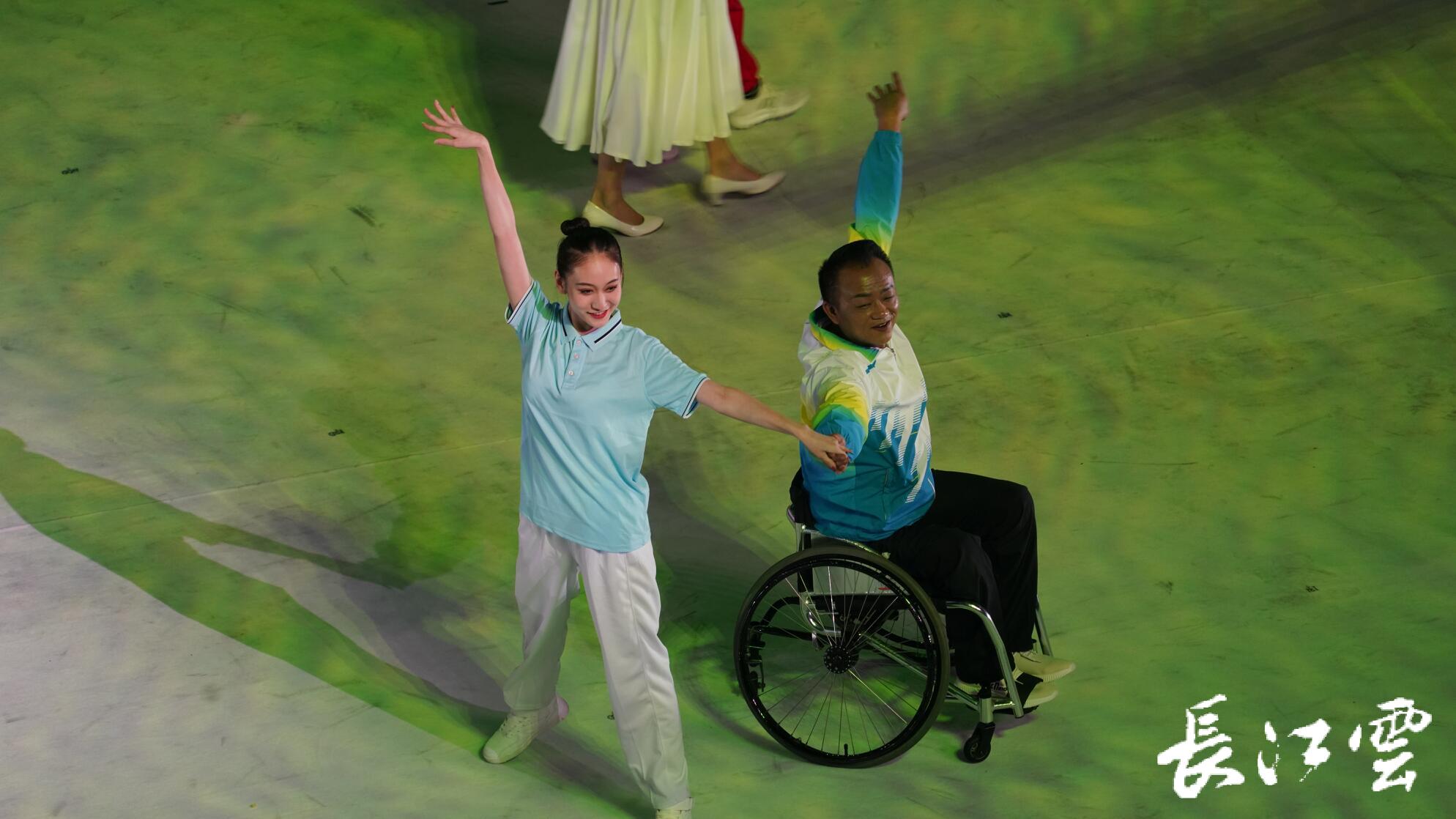 开幕式上,爱心涌动,温暖四方,《石榴花开》的序曲上,9岁肢体残疾女孩舞动在灿烂的花海下。在第一篇章中,情景歌舞与戏剧舞蹈交融,其中主演轮椅舞蹈表演者陈志刚是湖北武汉人,他的轮椅舞蹈让精彩纷呈的舞台描绘出湖北色彩。