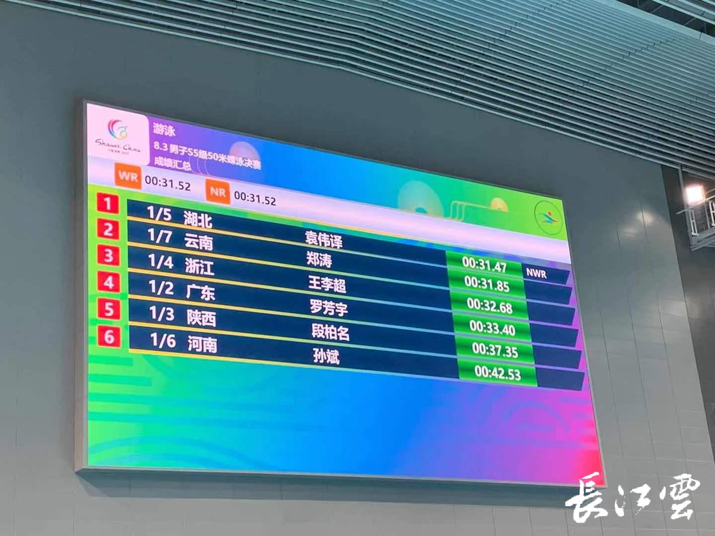 10月26日,全国第十一届残运会暨第八届特奥会男子S5级50米蝶泳决赛中,00后湖北选手袁伟译以31秒47的成绩打破世界纪录,为湖北代表队摘得第一枚金牌。