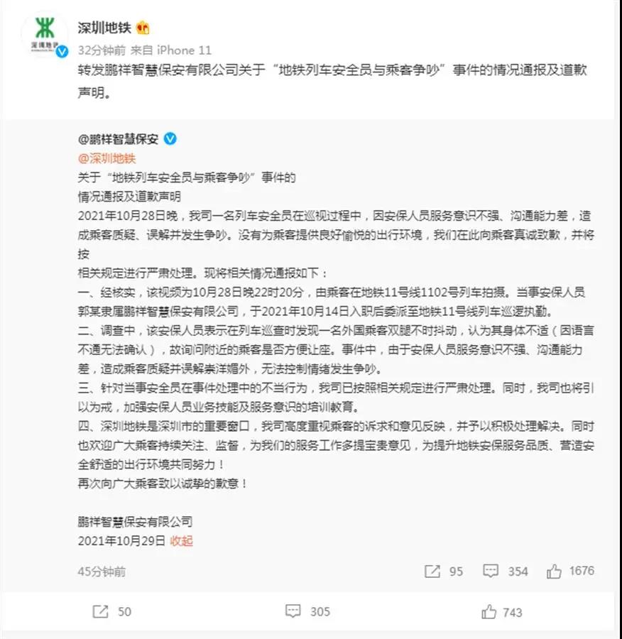 随后,深圳地铁官方微博转发了这一条致歉微博。