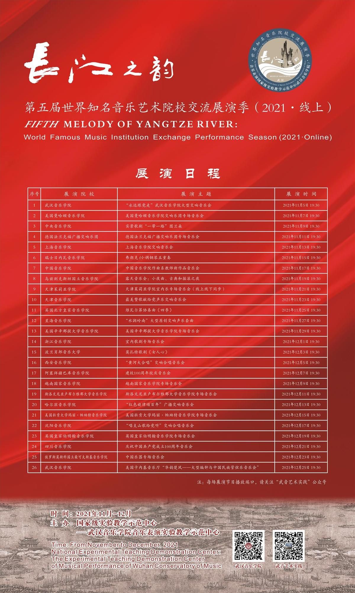 “长江之韵——世界知名音乐院校交流展演季”活动由武汉音乐学院国家级音乐表演实验教学示范中心主办,从2017年至今连续举办,已带来173场高水平音乐会、学术讲座、大师公开课和工作坊活动,成为具有国际影响力的艺术院校人才培养、艺术表演、艺术创作、学术研究深度融合的艺术交流展示平台,也为繁荣武汉城市音乐文化建设作出了积极贡献。