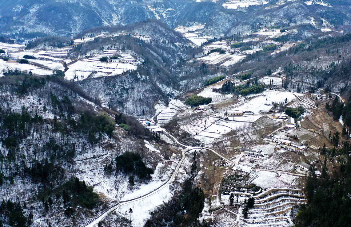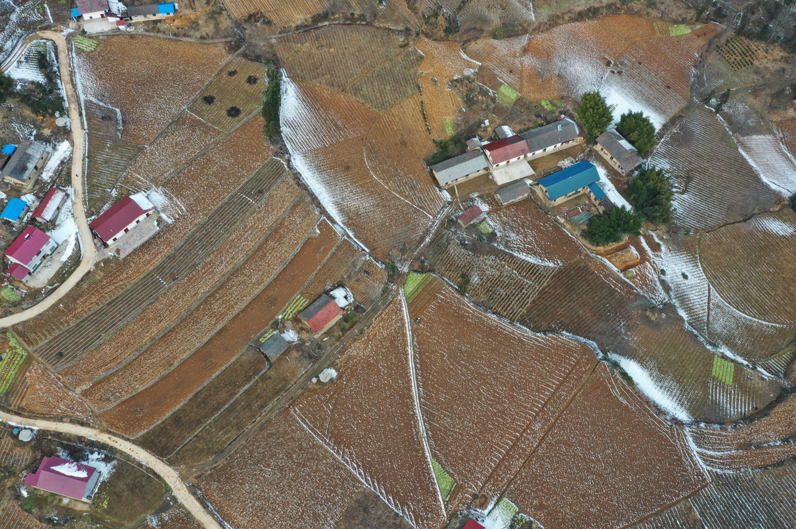 2021年1月10日,宜昌市秭归县高山地区下了一场小雪,海拔1000米以上的山区有积雪,稍低的地区只有背阴和低洼的地方存了一点花花雪,好似绣娘给大地绣了一道白边,一片片已经耕种的土地勾勒的更加清晰,一块块冬季特有的蔬菜或是小麦绿绿的,给寒冷的季节带来一丝春意。高山的初春别有一番风味。
