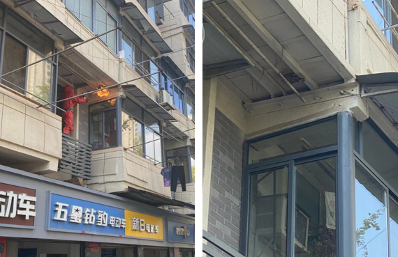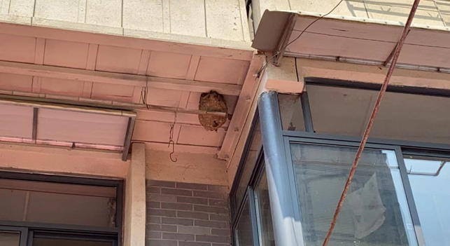 在修剪树枝的同时,现场社区工作人员又接到小区马蜂窝扰民的事件,居民称窗户外不知道什么时候“长”出了一个巨大的马蜂窝,全家人提心吊胆,不敢开窗,生怕被马蜂蛰到。工作人员马上随居民到现场查看,发现马蜂窝的个头较大,一大群马蜂在此处“安家”,如不及时清理,会对小区居民的生活造成影响。