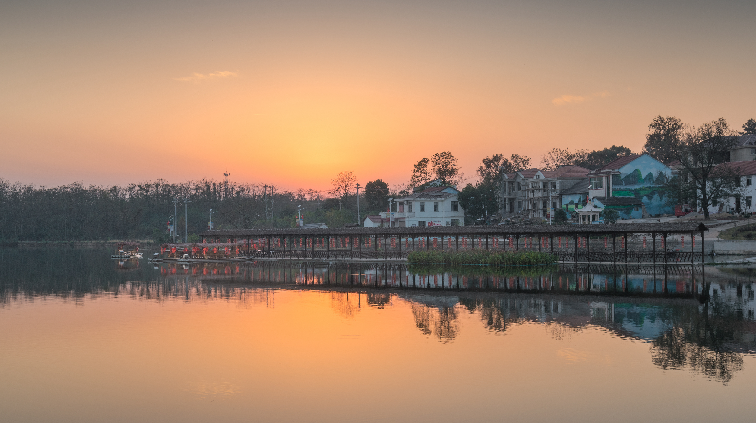 一轮落日从湖面落下,红霞照映湖山,水天一色,美景如画。