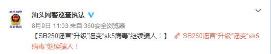 此外,上海市第三人民医院、玉林市第一人民医院、重庆市第三人民医院等地不幸“躺枪”,SK5病毒谣言不断更新“版本”在网络上流传,各地网警纷纷出来辟谣。