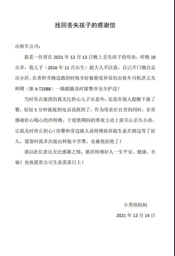 14日,孩子妈妈专门给出租车公司送去了感谢信:“我是一位曾在2021年12月13日晚上丢失孩子的母亲……非常感谢好心暖心的洪师傅,于疫情期间的寒夜主动上前关心。”
