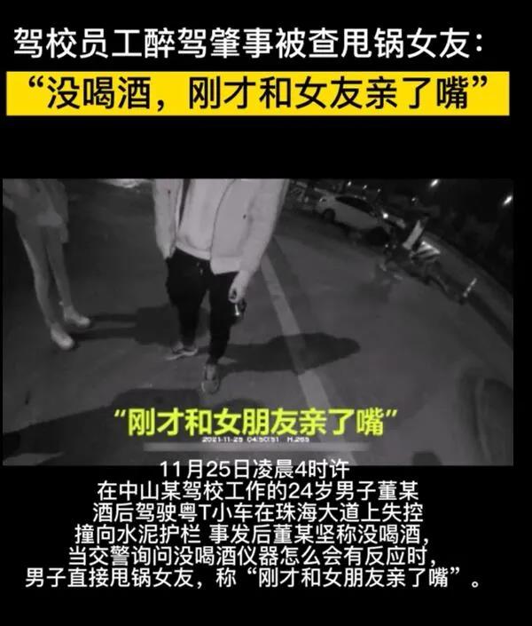 事发后,董某坚称没喝酒,当交警询问没喝酒仪器怎么会有反应时,男子直接甩锅女友,称“刚才和女朋友亲了嘴”。