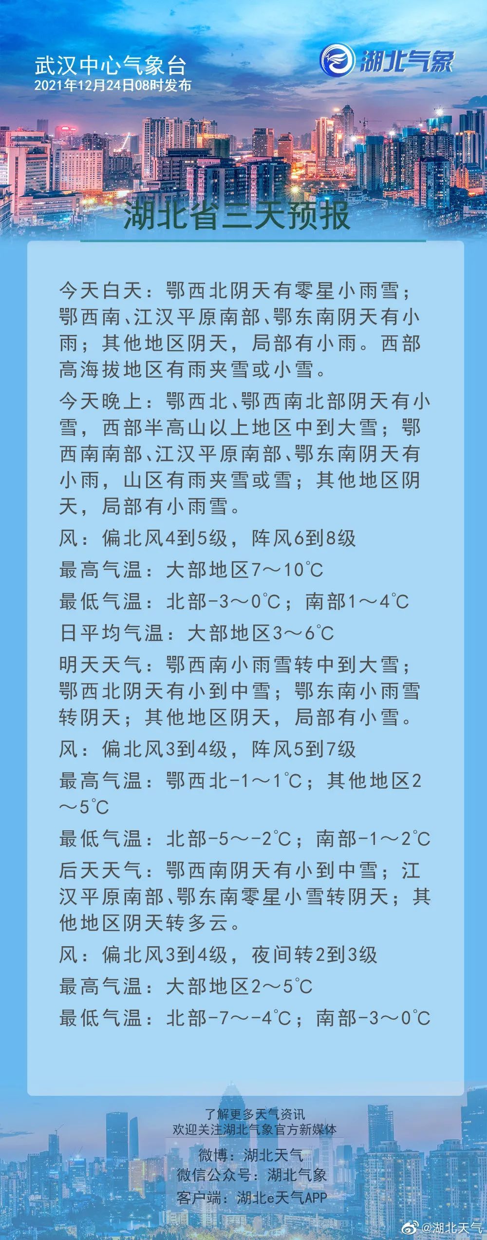 据湖北气象部门预报,今天,鄂西北、鄂西南北部、鄂东北北部小雨转小雪,西部半高山以上地区有小到中雪,局部大雪,江汉平原南部、鄂东南阴天有小雨,其他地区小雨转雨夹雪,伴有偏北风4~5级,阵风6~8级。明天鄂西地区仍有中到大雪,其他地区雨雪逐渐停止,转为阴天。风力依旧比较大,阵风有5~7级。