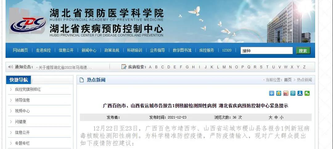 广西百色市、山西省运城市各报告1例核酸检测阳性病例,湖北省疾病预防控制中心紧急提示。