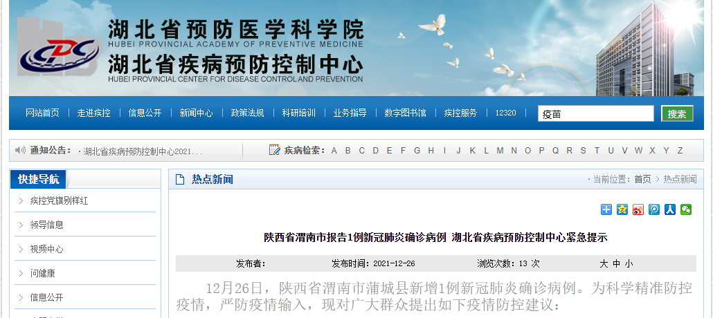 12月26日,陕西省咸阳市、渭南市相继报告新冠肺炎确诊病例,湖北省疾病预防控制中心连发2条紧急提示。