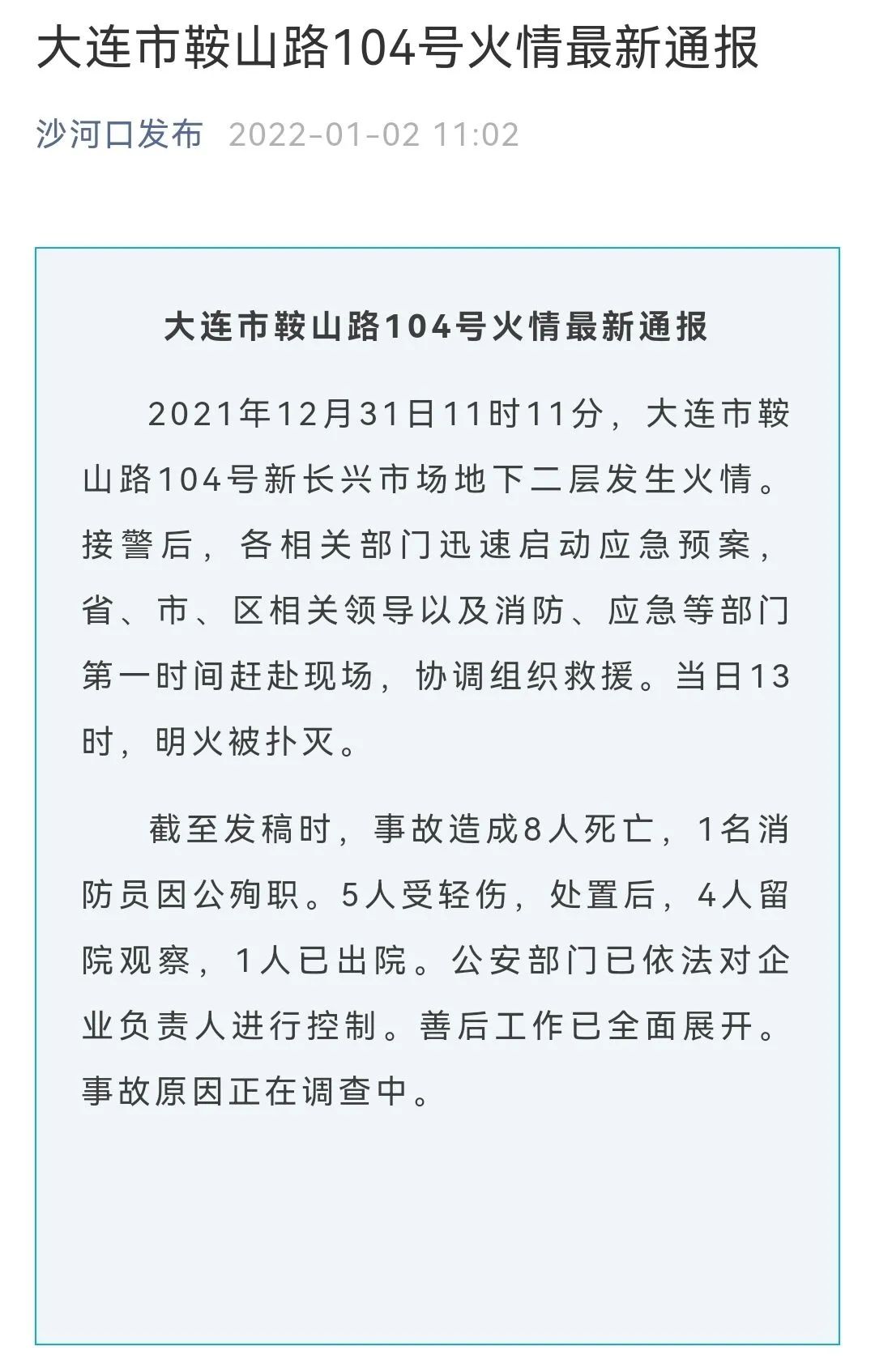今日上午,大连市沙河口区发布最新通报:事故造成8人死亡,1名消防员因公殉职。5人受轻伤,处置后,4人留院观察,1人已出院。公安部门已依法对企业负责人进行控制。善后工作已全面展开,事故原因正在调查中。