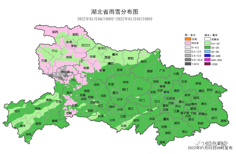 4日天气:全省阴天有小到中雨,其中鄂西北山区雨夹雪转中到大雪, 鄂西南高海拔地区有雨夹雪。