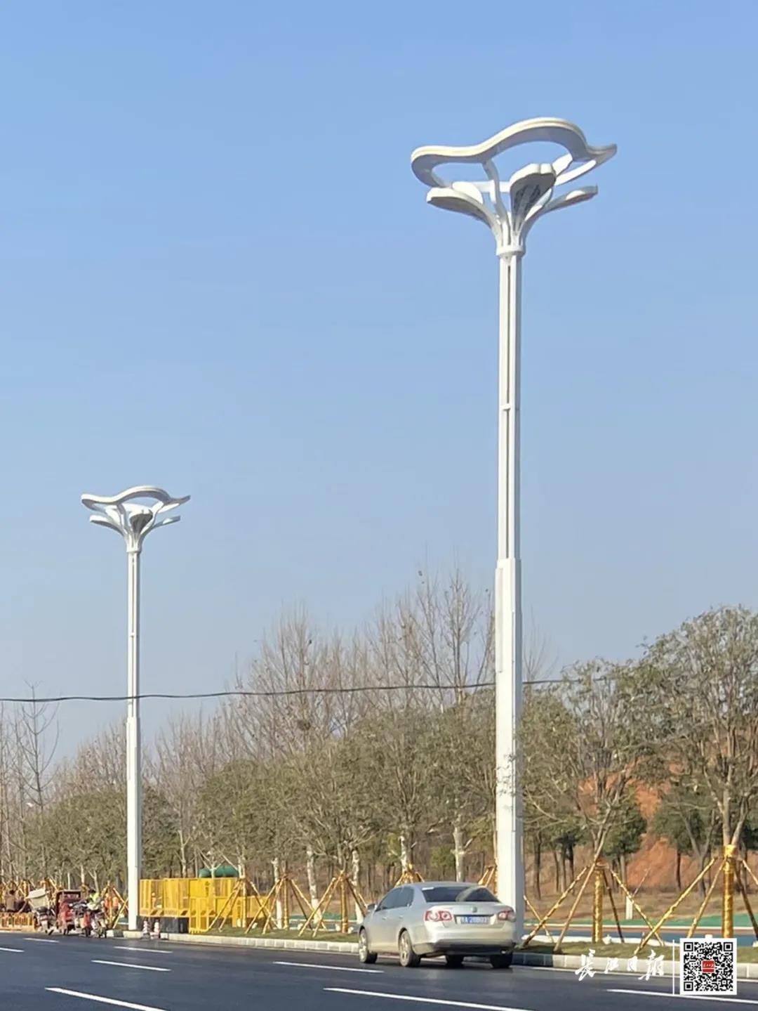 记者在高新二路(泉井西路—未来二路)段看到,一条宽阔平坦的大道展露新颜,道路两侧已安装好优美花型的智慧路灯,路边的花坛种上了富有造型感的花草。