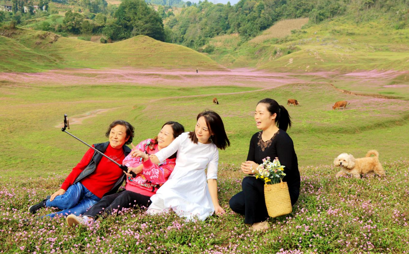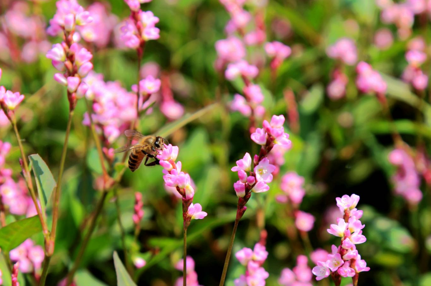深秋时节,在湖北省恩施市白杨坪镇熊家岩鳝孔坝的一处湿地大草坪上,成片的山间野花愉悦蓼遍地盛开,宛如粉红色的海洋,呈现出极具地域特色的深秋美景。