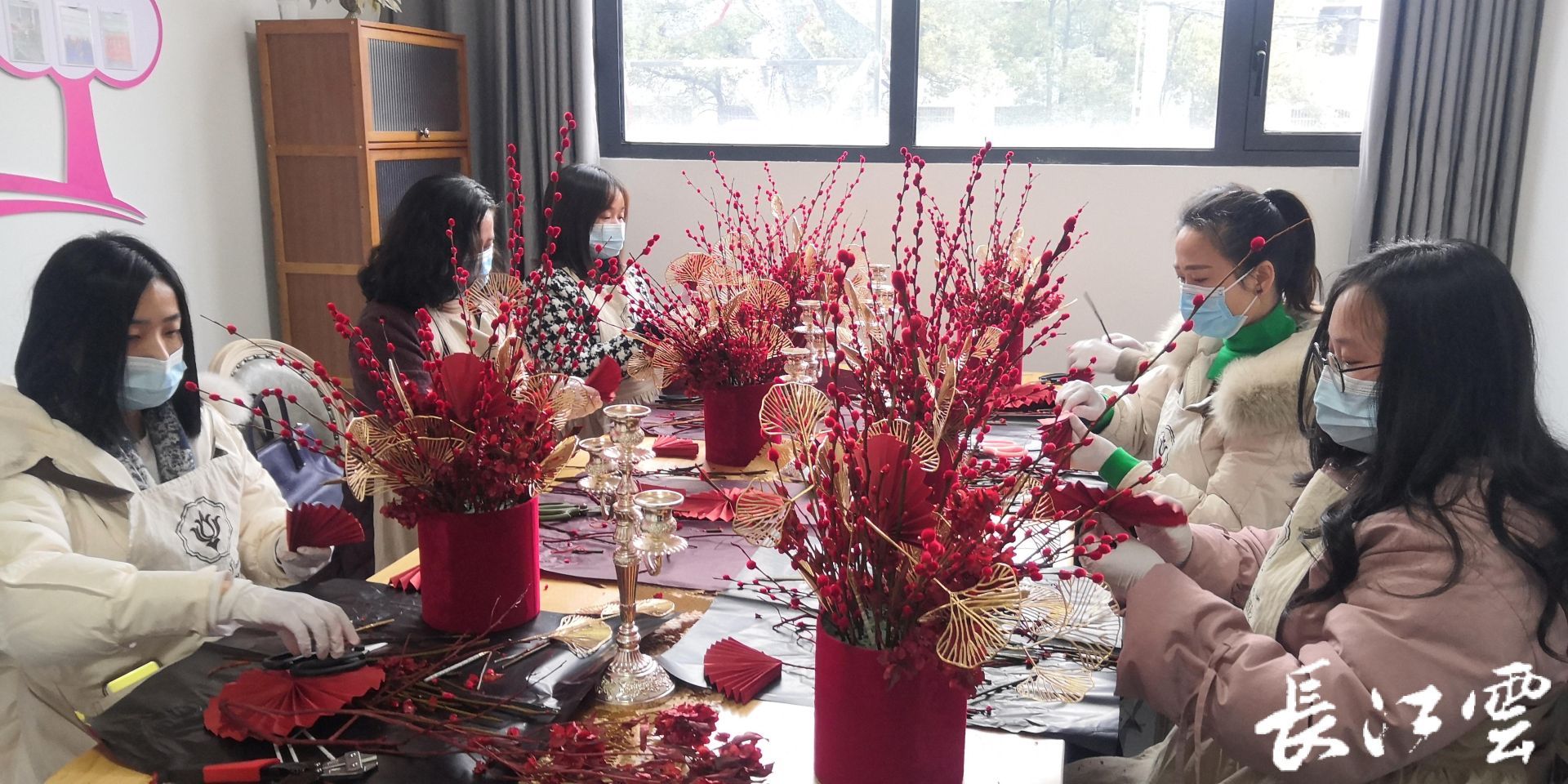 走上二楼,是一间花艺工作坊。花艺师教导,辖区居民手工制作,一盆盆漂亮的插花,让年味更足。这样的手工活动,向居民传递更多不同的生活方式。